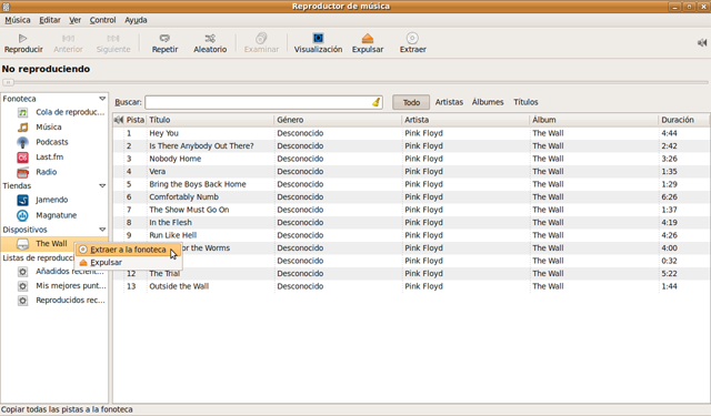 4. En el menú emergente seleccione Extraer a la fonoteca. Se inicia entonces el proceso de extracción sobre cuyo progreso puede ver información en la parte inferior derecha de la barra de estado de la aplicación.
