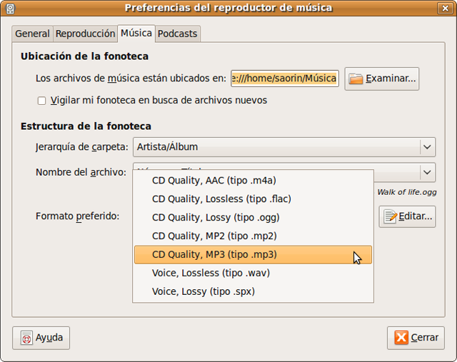 Si no se muestra la opción de MP3 en la lista de Formato preferido, instale el paquete gstreamer0.10-plugins-ugly-multiverse y reinicie Rhythmbox. Deberá aparecer la opción Calidad CD, MP3 (tipo .mp3) en la lista de Formato preferido. Para ver cómo hacer esto vea más arriba la sección Instalación de codecs multimedia.