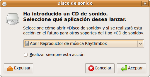 Cuando usted inserta un CD de audio en la lectora se le pedirá confirmación para abrirlo con el reproductor Rhythmbox, que tiene un aspecto similar a iTunes.