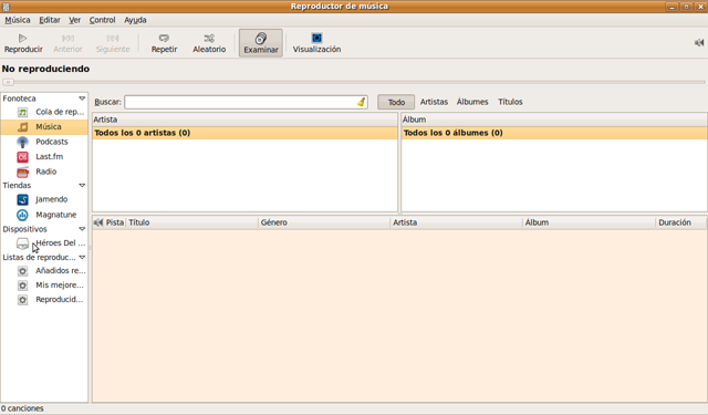 Verá entonces la ventana principal de la aplicación. Rhythmbox permite reproducir audio desde diversas fuentes: mp3, ogg, podcasts, radio en internet, CD de audio, etc., así como organizar sus archivos y listas de reproducción.