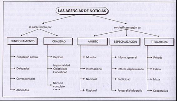 Las agencias de noticias son organizaciones cuyo objetivo es obtener la mayor cantidad de informaciones posibles y venderlas a los diferentes medios de comunicación. Constituyen para los periódicos las fuentes externas por excelencia.