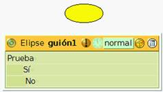 En este caso, y para ejemplificar el funcionamiento de los guiones condicionales, se ha elegido una opción sencilla. Se trata, como se explica en el cuadro de texto conectado a la elipse, que ésta adopte el color verde cuando la respuesta sea correcta y rojo cuando sea falsa.